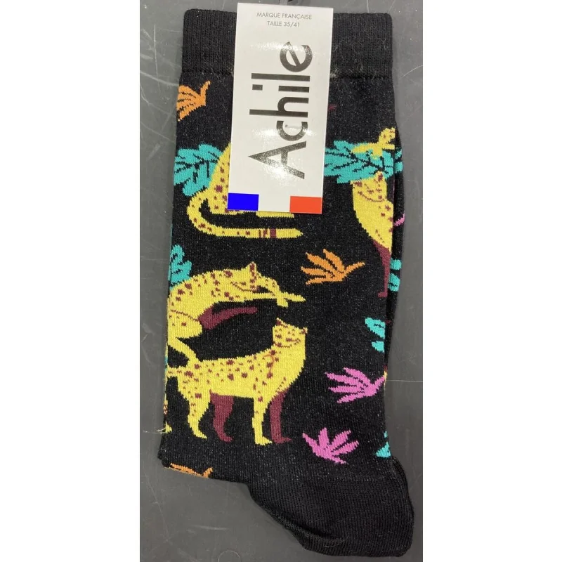 Achile propose une paire de chaussettes de conception française avec un motif rigolo de savane et de guépard : Si vous cherchez à ajouter une touche de couleur et d’amusement à votre tenue quotidienne, vous allez adorer ces chaussettes disponibles en couleur tendance.