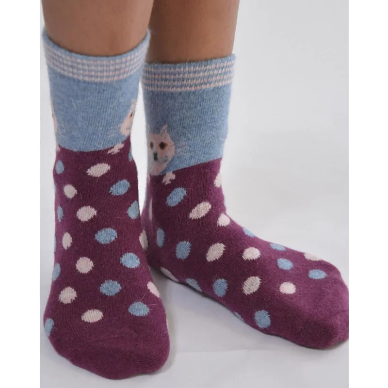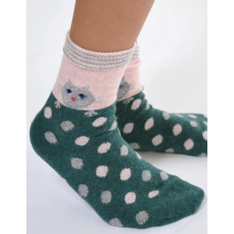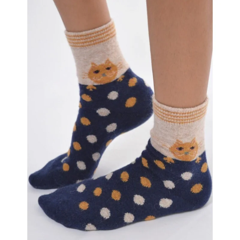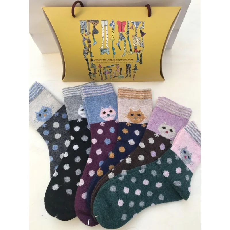 Un petit clin plaisir ces chaussettes tendance à pois rigolos et chats marrant. Ces chaussettes sont composées d’un mélange de laine et d’angora douces et chaudes.