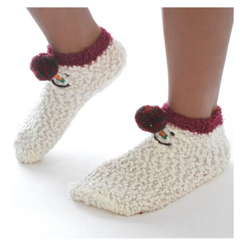 C’est un joli bonhomme de neige qui sert de thème à ces jolis chaussons en bouclette de polaire épaisse et douces, de jolies chaussettes rigolotes que les enfants vont adorer et les parents aussi…