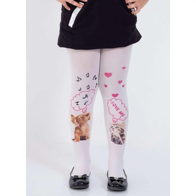 Ces collant rigolos enfants en base blanches sont décorés d’un chien qui chante pour sa belle une chatte qui lui envoie plein de petits coeurs d’amour…