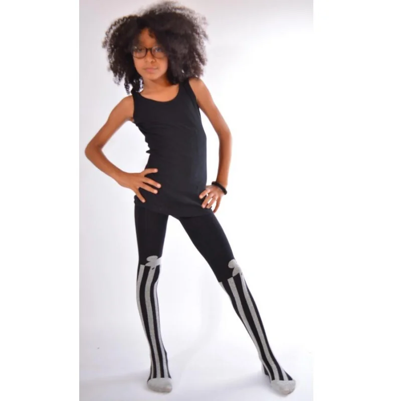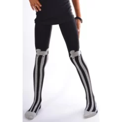 En base noire ce collant à rayures blanches reproduit un joli profil de de souris délire, ces collants enfants sont en coton tricoté tout doux et confortable.
