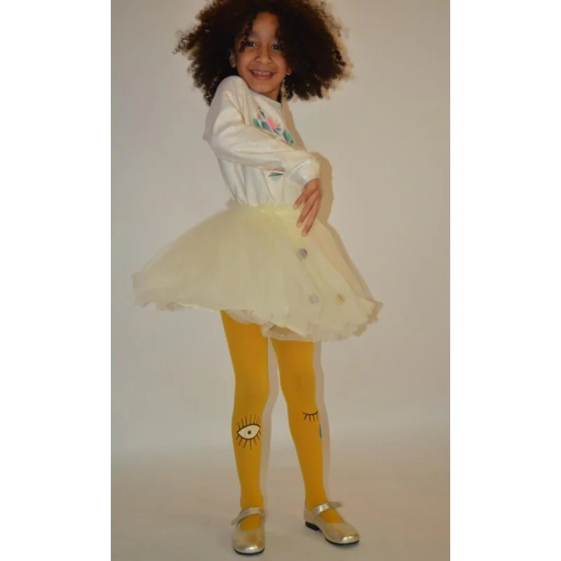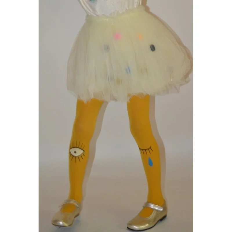 Ces collants fantaisies sont asymétriques avec d’un coté l’oeuil qui rit de l’autre celui qui pleure. en coloris moutarde le modèle plait beaucoup pour sa couleur de bas très pêchue.