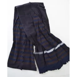 L’écharpe De Berthe aux grands pieds permet de se maintenir au chaud avec une création de 160 cm , on peut faire 2 fois le tour du cou tout en mettant son col à l’avantage par un jeu de fines et larges rayures asymétrique en marin et marron.