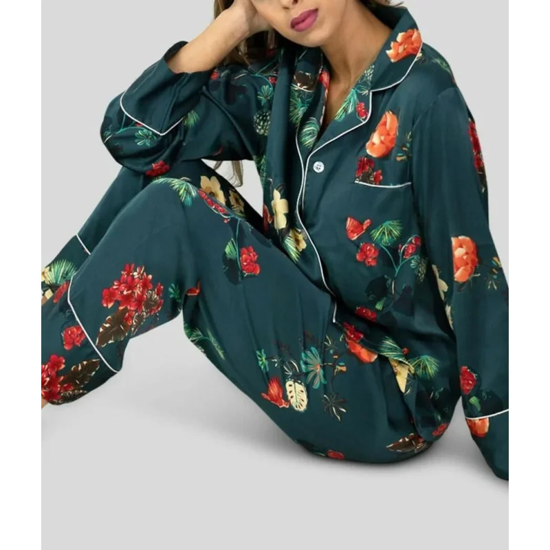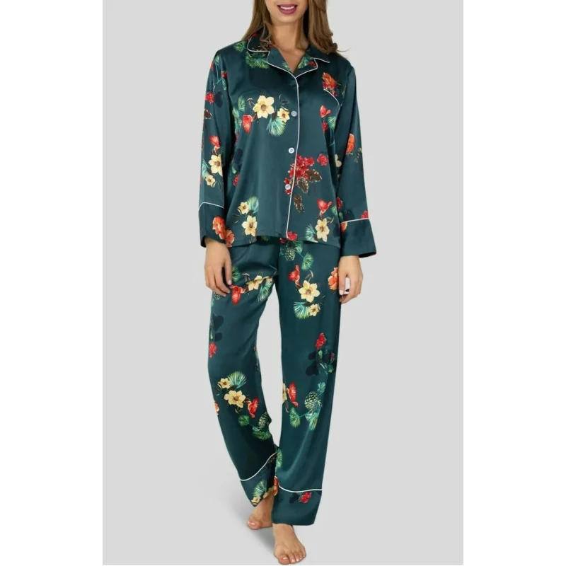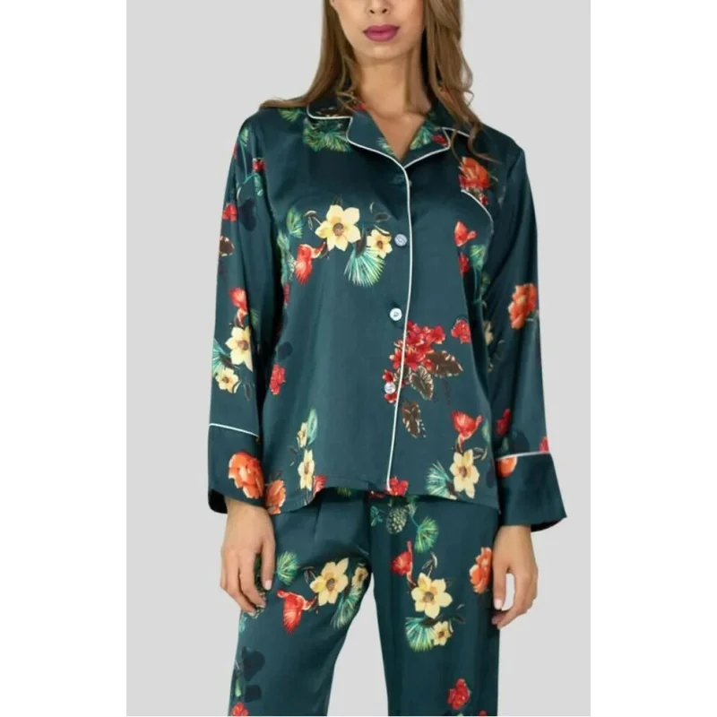 Ensemble Pyjama satin en tissu imprimé, composé d’un pantalon doux souple et d’un haut manche longue boutonné à col chic