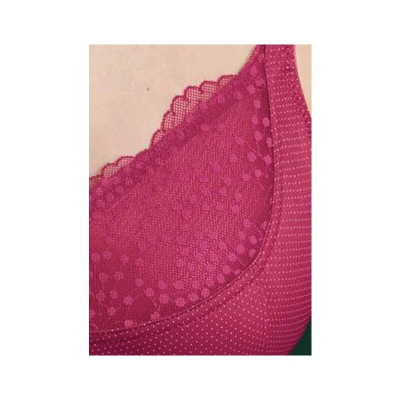 Ce soutien gorge sans armatures se fait très tendance imprimé de petits pois roses sur tricot rouge.