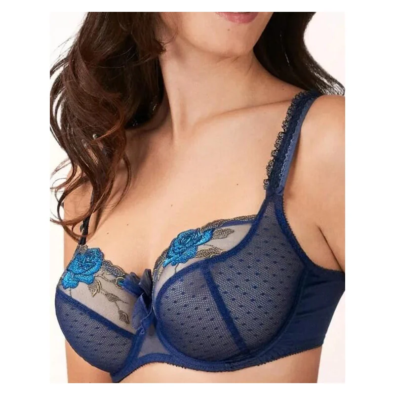Les bonnets sont ornés d’un tulle plumetis en bas du bonnet, pour compléter la séduction une rose brodée et des frou-frou sur les bretelles des soutien-gorge Empreinte Garance rendent de la poésie à votre marque lingerie grande taille.